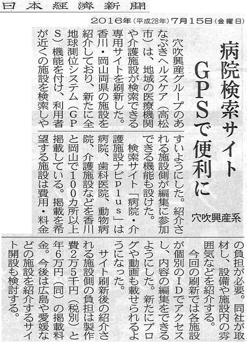 病院・介護施設ナビPlusが2016年7月15日(金)の「日本経済新聞」に取り上げられました。